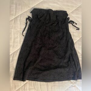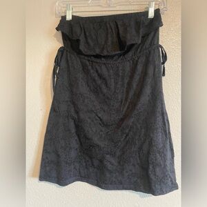 Black tunic shirt from Guess. Strapless with ruffle detail along the top. Subtle light black on dark black cheetah print pattern. Ties on the sides to tighten just below the bust line. Size S.