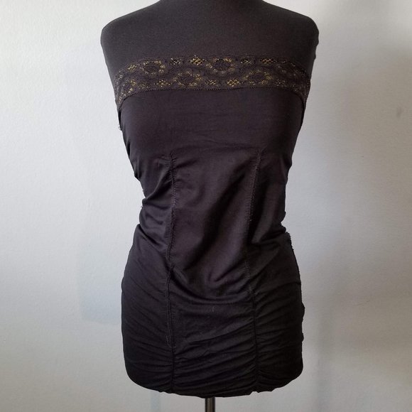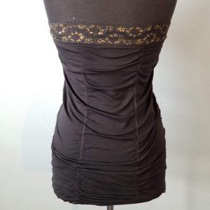 Flattering Guess Stretch Sleeveless Tank with Gold Lace Accent and Ruching.