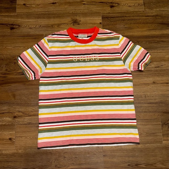 Vibrant tee with red, green, yellow, and white stripes. Perfect for casual wear. Vintage style. Guess Original.