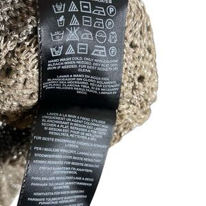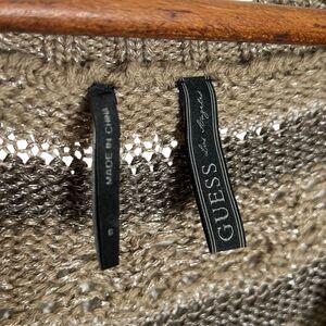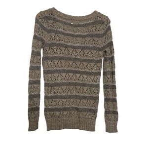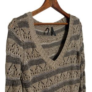 Guess Striped Wool Blend Open Knit Metallic V-Neck Sweater Taupe Gray Size Small