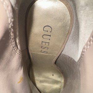Guess Suede Casper Peeptoe Ankle Booties Size 6. Mauve beige, 1/4" platform, 4" heel. Gold hardware on buckles and zipper. Wore a couple times, still has original felt on sole. Some marks inside (see pictures), slight wear on heel, one strap missing on top left buckle, no box.