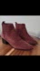 Rusty red / burgundy suede ankle boots. Slip on style. Pull tabs on the heels. Elastic on sides for easy on and off. Pointed toes. Western styling. Guess logo on metal at heels.