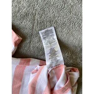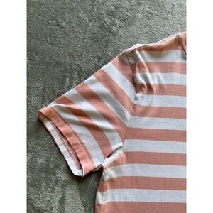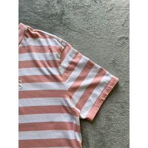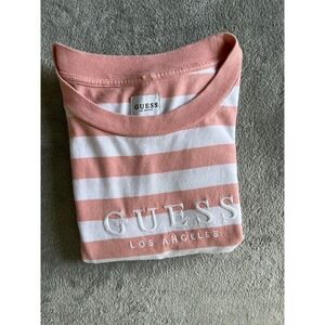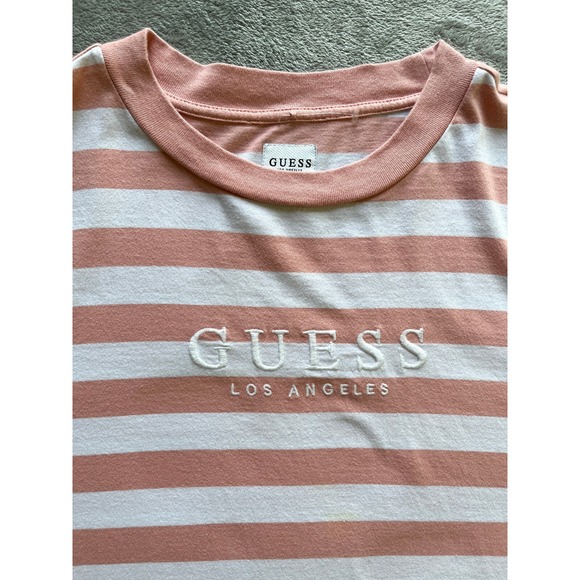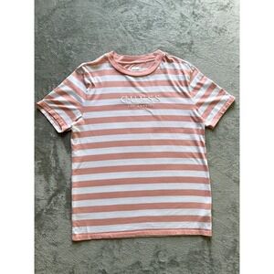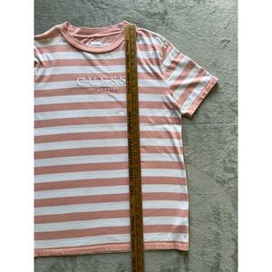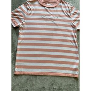 Guess TShirt Mens Medium Pink White Striped Embroidered Logo Short Sleeved Crew