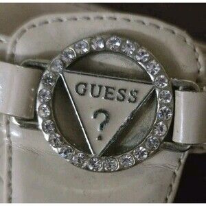 The product is a pair of Guess T-Strap Thong Sandals in beige, creacre or light tan color with logos. They are designed for women in size 7 with a slip-on closure and a flat heel height, making them suitable for summer and spring seasons. The sandals feature rhinestone accents, adding a touch of glamour to the stylish design. Ideal for casual wear, these sandals are a fashionable choice for warm weather days.