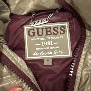Classic and versatile Guess puffer vest in a neutral beige-tan color.