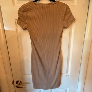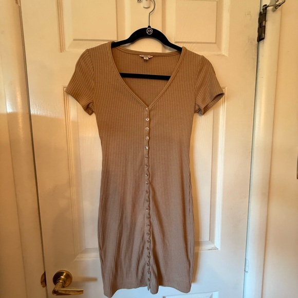 Stylish ribbed mini dress. Features button-down front. Perfect for casual outings.