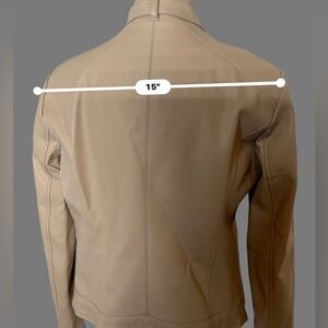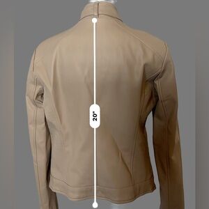 Sleek taupe leather jacket by Guess. Features zippered pockets and a modern design.