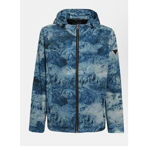 GUESS Tech Woven Hooded Jacket in a stunning blue color. The jacket is made of high-quality polyester material that ensures durability and comfort. The mid-length windbreaker jacket is perfect for men who prefer a regular fit and features a zip closure. The hooded jacket is designed to keep you warm and dry during chilly, windy weather.