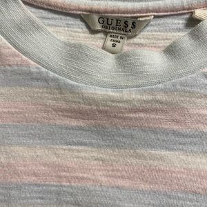 Really great condition pink and blue striped Guess tee. Men’s size small fits cute oversized women’s small or medium.