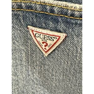 The Guess The It Girl Pin Up Super High Waisted Jeans in size 27 feature a medium blue fabric wash and a high waisted style. The jeans have a button closure with a 28-inch inseam.