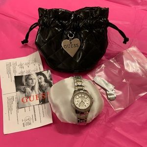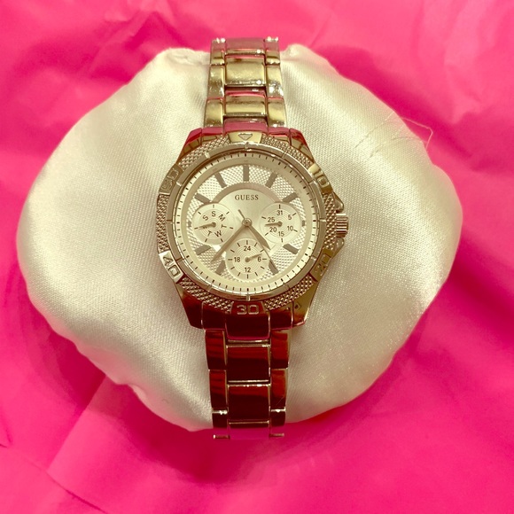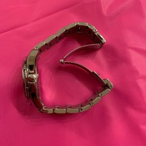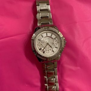 Watch from Guess. EUC. I wore it a few times but it was too chunky for the dressy occasions I bought it for. Needs a new battery. Comes with pieces to lengthen the band.