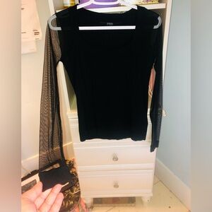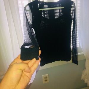 Wore once, the material is very stretchy, the arms are long sleeved mesh material, great for any event