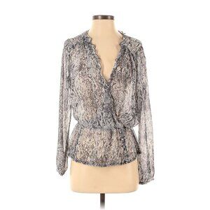 Guess Top Gray Snake Print Sheer Long Sleeve V Neck Ruffle