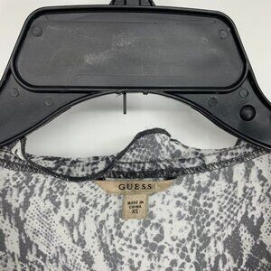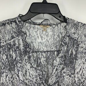 Guess Top Womens Size XS Gray Snake Print Sheer Long Sleeve V Neck Ruffle. Great pre-owned condition. Chest: 18"