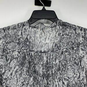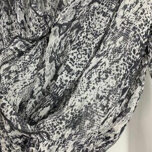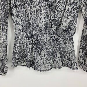 Guess Top Womens Size XS Gray Snake Print Sheer Long Sleeve V Neck Ruffle. Great pre-owned condition. Chest: 18"