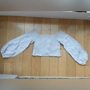 Perfect condition, really cute off shoulder crop top from Guess. White with pinstripes. Bandage-like type with relaxed 3/4th sleeves and elasticized cuffs. Ruffled trims. Criss cross detail at smocked pullover bodice.