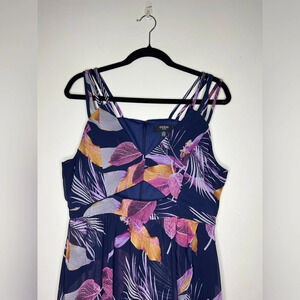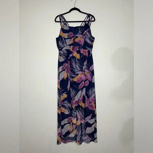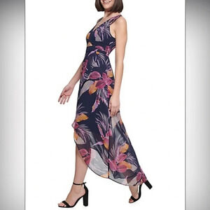 This tropical high low chiffon maxi dress by Guess is in excellent condition! The dress is navy blue with beautiful shades of pink, orange and lavender. Lined/padded cups in bust area. Perfect for summer or wedding guest dress!