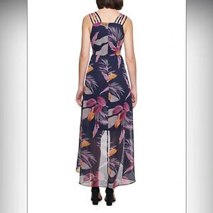 Guess Tropical Floral Navy Blue High Low Maxi Chiffon Maxi Dress Lined Sz 12