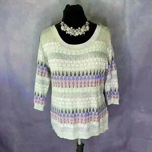 Really pretty high/low hemmed tunic length sweater. Really cool pattern knit over a Navy blue base. The back is solid navy blue.