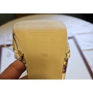 Elevate your shoe game with these gorgeous GUESS Tuxedo Floral Bow Leather Heels in Size 7.5. These strappy sandals feature an open toe design, buckle closure, and a stiletto heel style measuring high at 3-3.9 inches. The patent leather outsole and adjustable strap make sure the shoes are comfortable to wear while the beautiful multicolor floral pattern with bow accent adds a touch of elegance to your outfit.