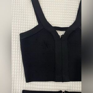 This is a matching two piece set from Guess. The top and bottom have a super flattering stretchy fit with an intricate ribbed design. The set clasps with a high quality zipper on the back of both the top and skirt. This set was only worn once, so it is in great condition. There is slight pilling on the front of the top from a snag, but otherwise there are no additional imperfections. Also, a few of the tags were torn out, but both the top and bottom are a size XS. This is the perfect simple black set!