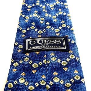 Guess USA American Classics Blue Abstract Geometric Print Short Wide Silk Tie Length: 55" Width: 4" Excellent Wearable Pre Owned Condition meticulously looked over no visible tears, stains, or smells. Pet And Smoke Free Environment 12M28