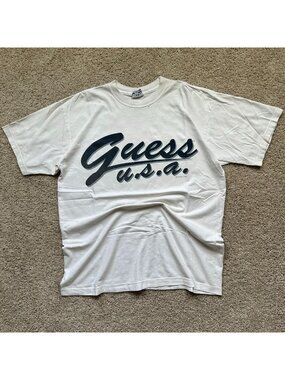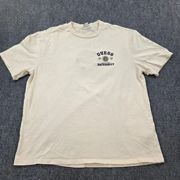Keywords: Guess, T-Shirt, University, Mens, Medium, Beige, Short Sleeve, Graphic Tee, Top, Casual, Crew Neck, Logo