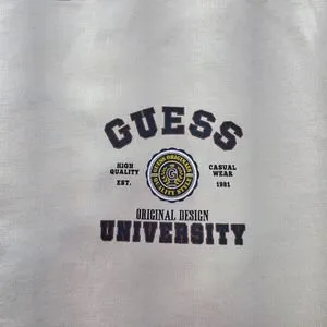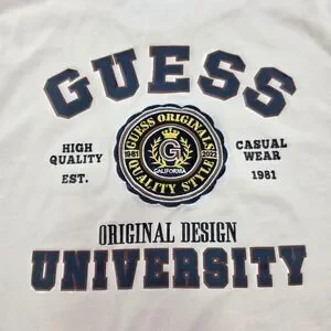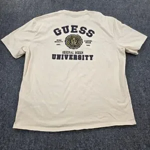 Elevate your casual wardrobe with this Guess University graphic tee, a testament to both comfort and style. This beige short-sleeve t-shirt features a classic crew neck and a bold "Guess University" graphic on the front and back, showcasing the brand's iconic logo and established date. The shirt exudes a collegiate vibe with its carefully embroidered seal, capturing the essence of high quality, originality, and casual wear. This tee is perfect for everyday wear, campus hangouts, or weekend adventures, adding a touch of sophistication and brand recognition to your relaxed look.