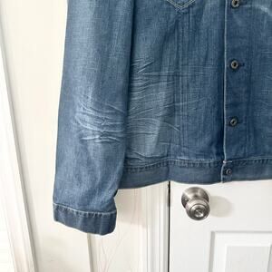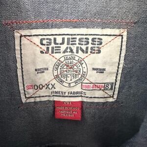 Size XXL from Guess. Vintage Y2K styling. Style number M2115931. Blue vintage trucker style denim jacket with white wash details and whiskering details throughout. Button dowm. Made in Mexico. Preowned in excellent condition with no stains or tears.