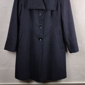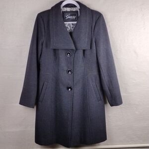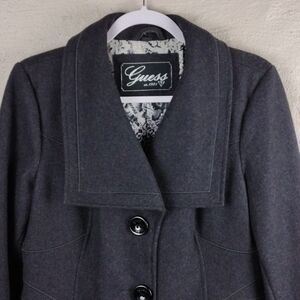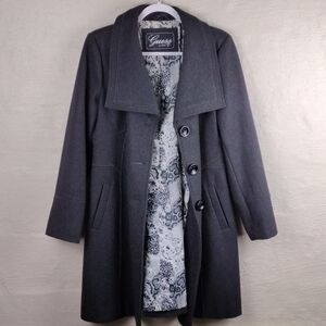 Guess Vintage Women's Dark Gray/Light Black Point Collar Three Button Down Front Closure Wool Blend Car Coat. Shell: 60% Wool, 29% Polyester, 1% Rayon. Lining: 100% Polyester. Two Front Side Pockets. Stain Above Tag Per Picture. Size Large. Color May Vary Due To Lighting.