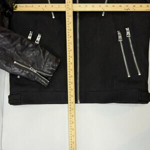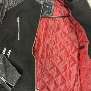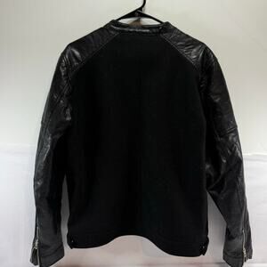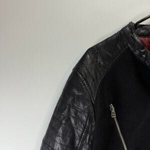 BLACK WOOL OUTER MATERIAL WITH LEATHER-LIKE POLYESTER SLEEVES WITH SEAMS ON SHOULDER SHOULDER SIZES, SLIM FIT CUT, ENGRAVED CLOSURES ON THE FRONT, MANGA COLLAR WITH ENGRAVED CLASP, WINE-COLORED POLYESTER PADDED LINING INNER MATERIAL, ADJUSTMENT CLOSURES ON CUFFS.