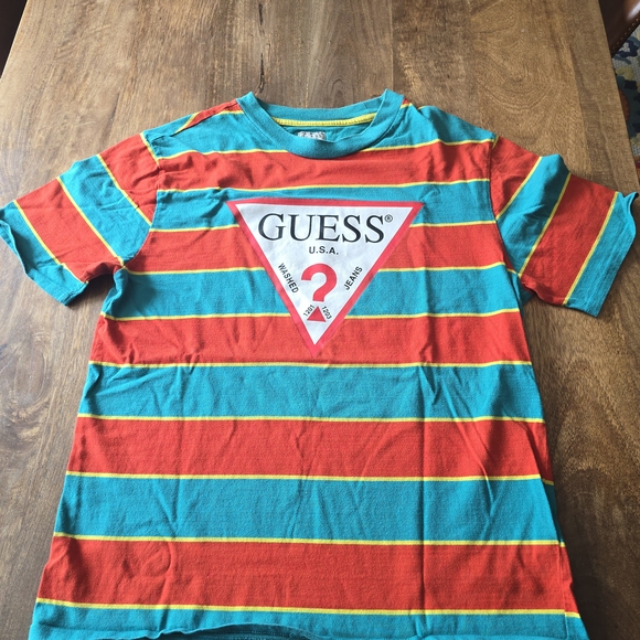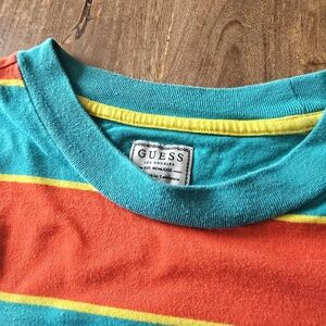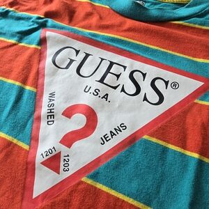 Throwback 90s vibes with this bold striped Guess tee. Features teal, red, and yellow horizontal stripes with the iconic Guess triangle logo front and center. Classic oversized streetwear look, perfect for pairing with jeans or layering.
