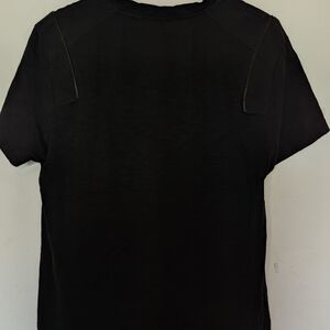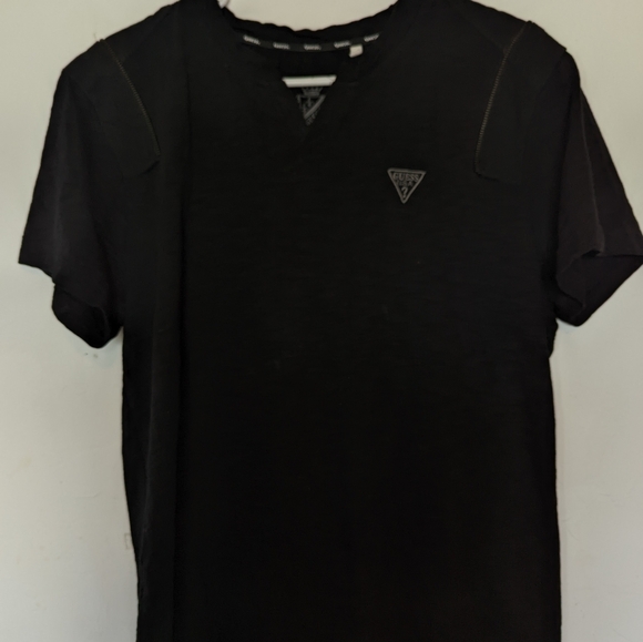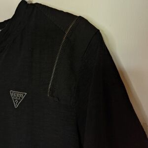 Guess black mens vneck shirt. Has a textured look. Two zippered segments on the shoulders. Embroidered logo on the chest. Size L, 100% cotton.