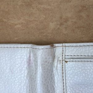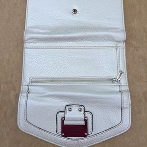 Pebbled faux-leather clutch gets a slim profile with this essential wallet, designed with a push-button flap top logo design on front flap. Snap-button closure. Exterior zipper pocket at back. This wallet has been used and does have some minor wear on the outside and inside at the fold.