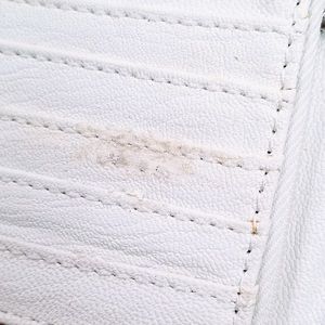 In used condition. The leather started to peel in one spot and there is a blue-ish stain on the front where the wallet clasps shut. All damage is pictured.