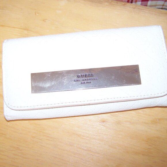 White with logo all over and a metallic logo bar on the front. Tan on the inside. Snap closure. 4 card pockets & 1 larger pocket on the inside of the flap. 2 ID pockets with 2 additional card pockets on the front. Open pocket, zipper pocket for change, 2nd open pocket with 6 additional card pockets & 1 larger pocket on the inside. Back has an open pocket and removeable zipper pocket pouch.