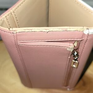 Pink with faux zipper front. Holds 12 credit cards and 1 ID holder. 3 slots for paper money or receipts. Change pocket that zips on back. Never used, however some of the binding around back left side is rubbing off and corner under coin zipper. Price Reflects