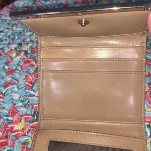 Per-owned very cute small Guess wallet with 3 cc slots, (1) mesh ID window, & a bill compartment. Silver hardware.