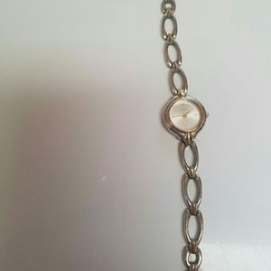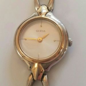 This guess watch is gold and silver. The pictures don't show the colors very well. The links can be removed to fit smaller sizes.