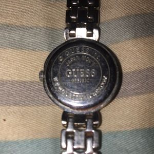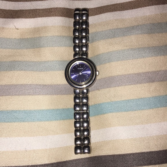 Ladies Guess Watch. Silver with cobalt blue face. Works but needs a battery.