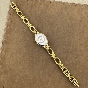 Guess Watch Gold Tone New Battery on Sale 15/16 by 11/16 Inch Oval Case Gold Hands and Raised Markers Silver Sun Burst Face Open Gold Link Bracelet 6.5 inch in length nice Japan Movement great fist watch