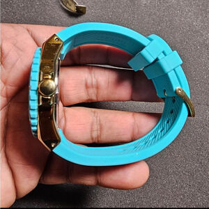Guess Waterpro Ladies Quartz Watch Gold Tone Case Blue Strap Working (U0149L3) shows signs of wear such as scratches on case and crystal see pictures for reference