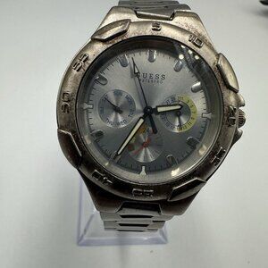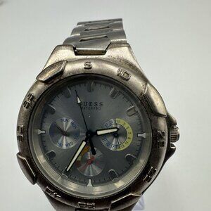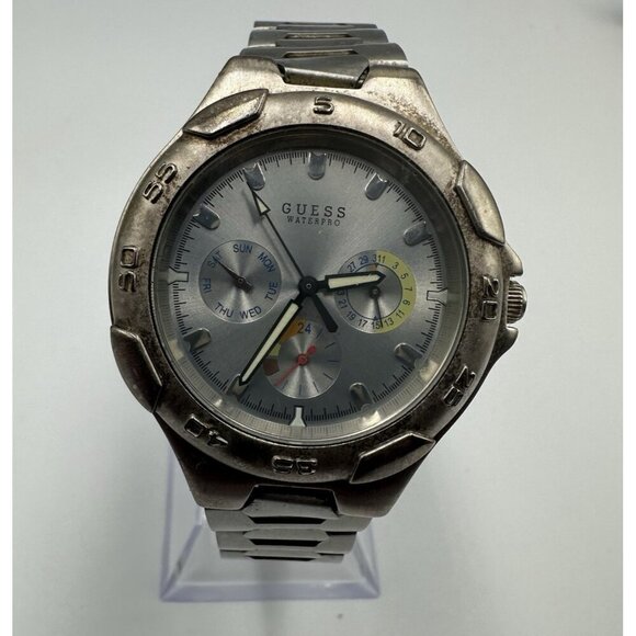 Guess Waterpro Watch Men Silver Tone 38MM Multi Dial Day Date New Battery 8"