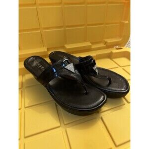 These Guess Wedge Sandals feature a solid black faux leather upper with a high wedge heel, making them a stylish and versatile addition to any wardrobe. With a flip flop design, these sandals offer a comfortable yet chic option for everyday wear. The size 11 makes them suitable for those looking for a larger fit, while the G by GUESS brand ensures quality and fashion-forward style. Perfect for adding a touch of sophistication to any outfit, these sandals are a must-have for any woman's shoe collection.