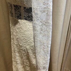 Chic Guess bodycon dress in white lace with sheer long sleeves, sweetheart neckline, and sheer lace waist detail. Fully lined for comfort. Pre-loved condition—note: small faint pink stain on one sleeve (see photos). Perfect for parties, bridal events, or night out. Quick shipping and open to offers!