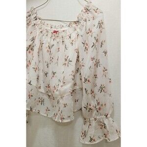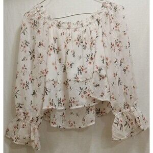This is a Guess brand white chiffon crop top with a pink floral pattern. It features an off-the-shoulder neckline, long peasant sleeves, and a pullover closure. The top is sheer and lightweight, suitable for casual wear during summer, fall, and spring. It is machine washable and made of 100% polyester. This size small blouse has a relaxed fit and is designed with a floral theme, making it a stylish addition to any wardrobe.