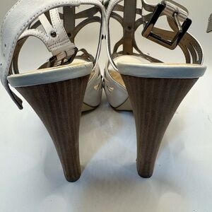 Elevate your style with these chic white sandals from Guess, featuring a sophisticated strappy design and a comfortable medium heel. The intricate woven pattern and ankle strap with buckle closure add a touch of elegance, making them perfect for formal occasions. Crafted with high-quality materials, these sandals ensure both durability and style.