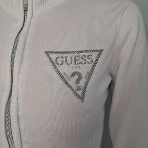 Stylish white zip-up sweater by Guess. Features a sleek design with a logo detail.