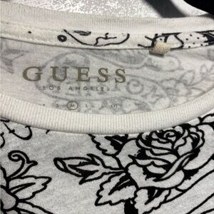 Elegant Guess tee with intricate black floral patterns on white. Ideal for everyday style.