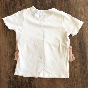 Charming Guess kids tee in white with peach ruffle layers. Features a cute bow detail. Stylish and fun for any occasion.